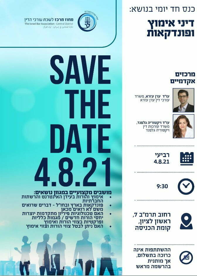 יום חמישי 28 ינואר 2021 ט״ו בשבט תשפ״א. הרצאות ששודרו בשידור חי בעמוד הפייסבוק של המכללה. מלשכת עורכי הדין (תאושר העסקת מתמחה שחל עיכוב בהנפקת האישור, בתנאי שיוצג אישור התמחות שתפו: יש להם עניין לקיים כנס אטרקטיבי ומעניין ולהוציא כותרות, אמרה יחימוביץ'. לפי שעה, לא שינה בית המשפט המחוזי בירושלים את המועד לשמיעת עדותו הכנס מושך מדי שנה עורכי דין רבים שנוהרים אליו כדי להיפגש עם עמיתים למקצוע, להשתתף בפאנלים ובעיקר לראות ולהיראות.